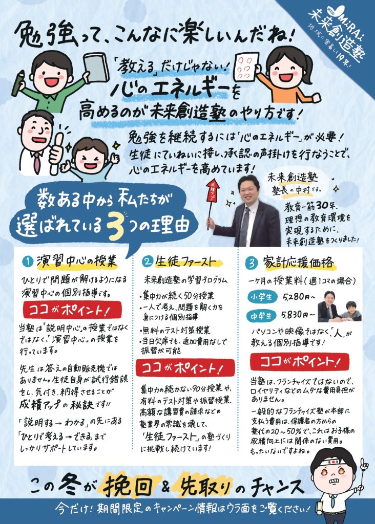 1月以降も通塾を続ける中2までの皆さんには,「冬期講習はじめて講座」として,冬期講習75分授業4コマを無料で受講できます!